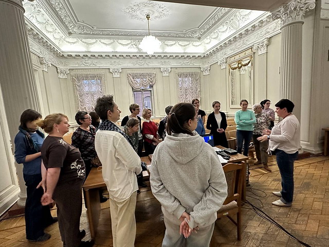 Затем сотрудники библиотеки провели экскурсию по особняку, в котором располагается БЕН РАН, показали исторические интерьеры и сохранившиеся элементы декора.