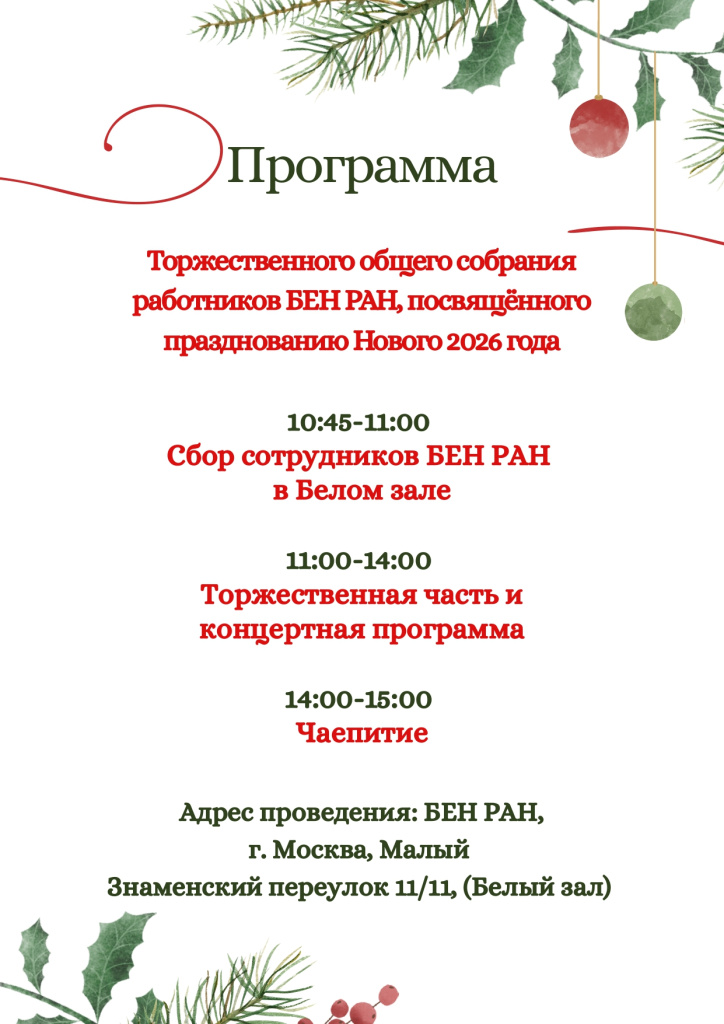 Приглашаем Вас принять участие в торжественном собрании коллектива БЕН РАН 24 декабря 2025 года в 11.00 в Белом зале главного здания БЕН РАН!